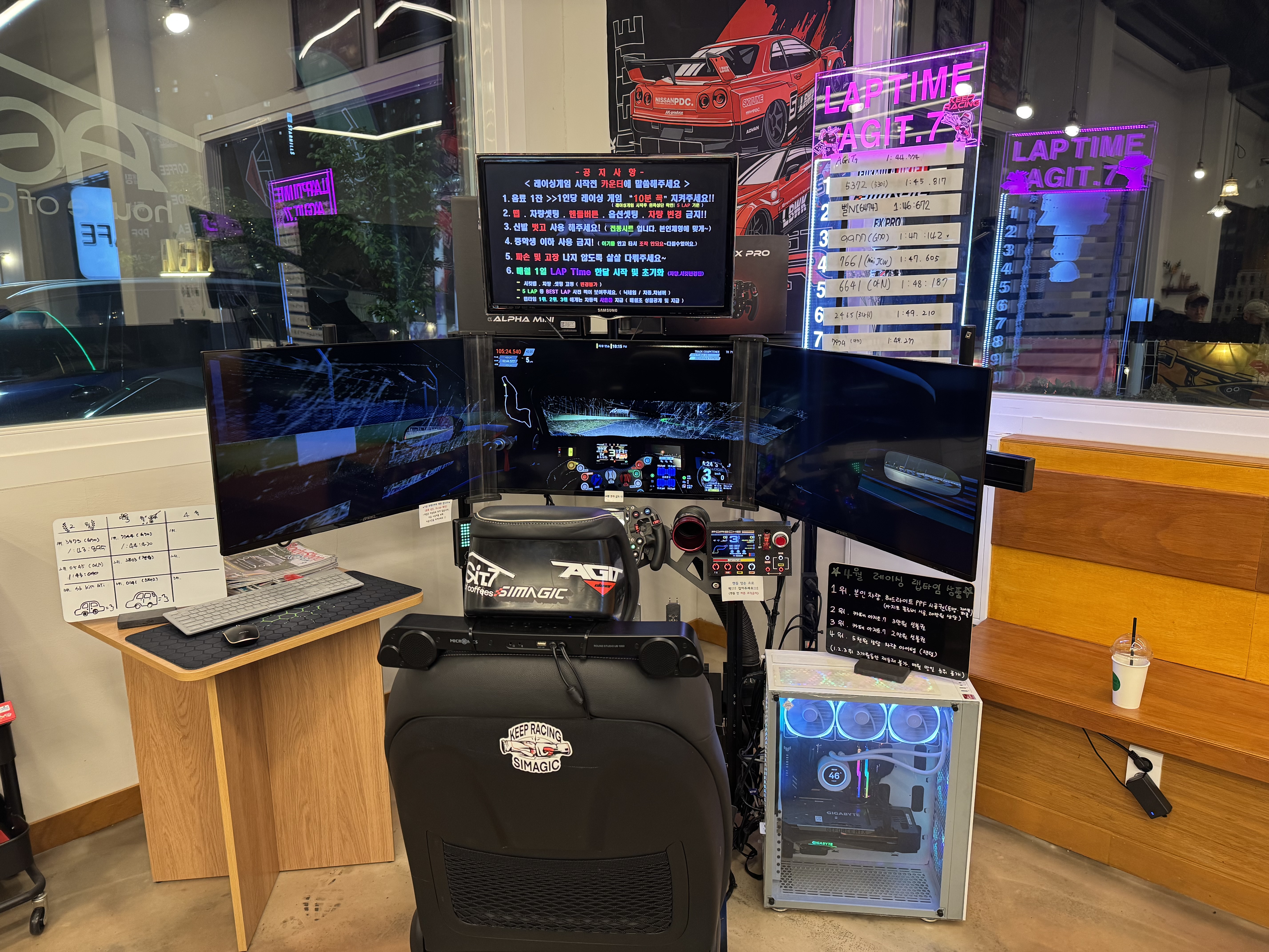 한쪽에는 레이싱 시뮬레이터도 설치되어 있어 이색적인 체험까지 가능한 색다른 분위기 였습니다.